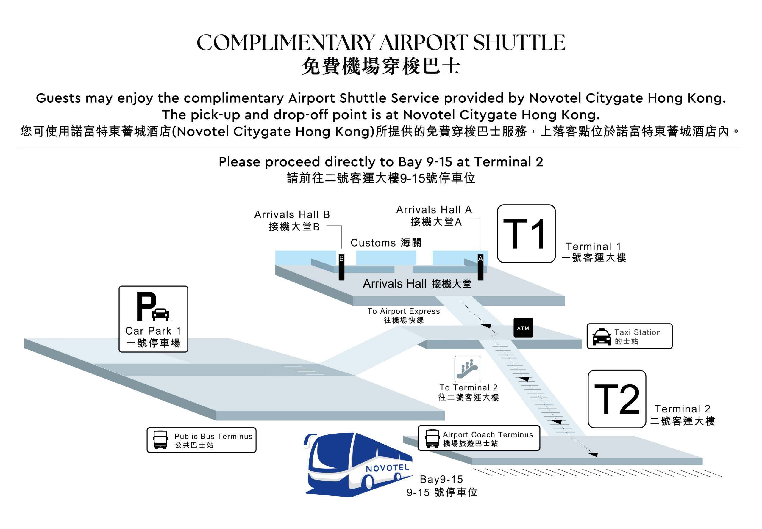 Guests may make use of the Airport Shuttle Service provided by Novotel Citygate Hong Kong, which runs every 20 minutes from 6am until 11:40pm. Both hotels are located in the same shopping mall, just a short walk apart. If you would like assistance booking a third party transfer service, please contact us before arrival or check out and we will be happy to assist.