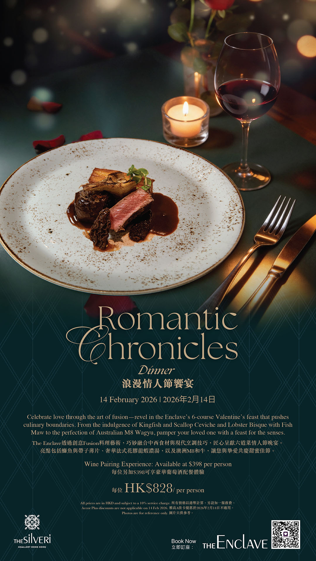 The Enclave透過創意Fusion料理藝術,巧妙融合中西食材與現代烹調技巧,匠心呈獻六道菜情人節晚宴。亮點包括鰤魚與帶子薄片、奢華法式花膠龍蝦濃湯,以及澳洲M8和牛,讓您與摯愛共慶甜蜜佳節。