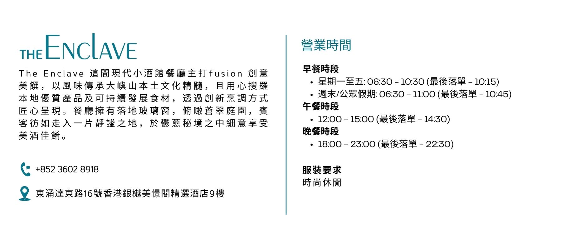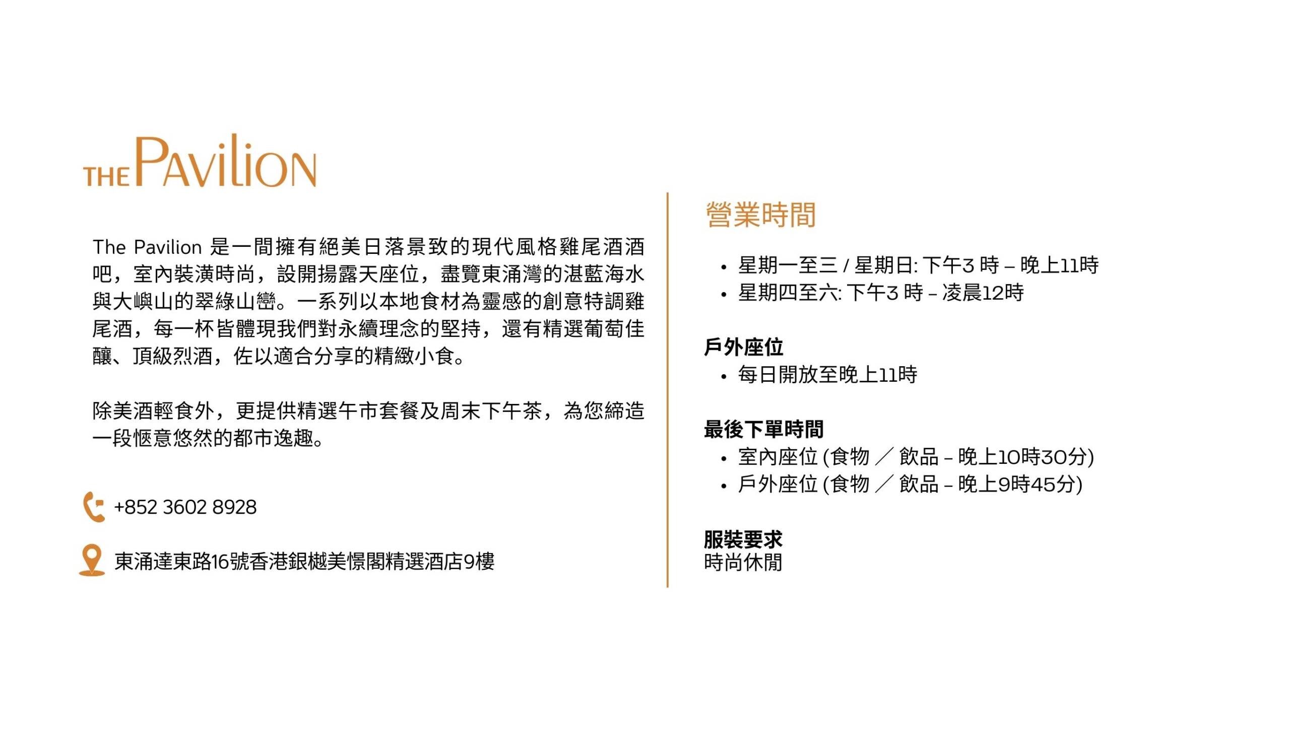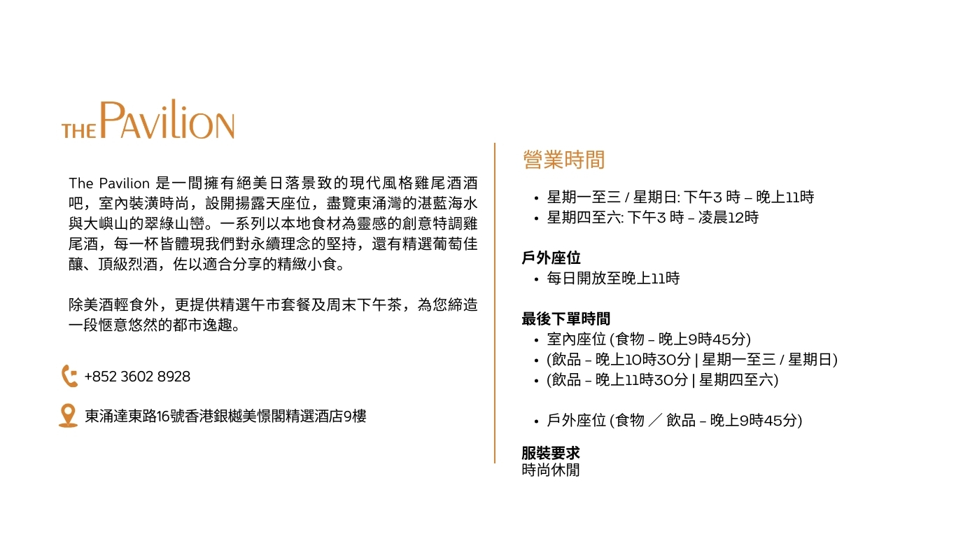 香港銀樾美憬閣精選酒店的餐飲都是精挑細選,食材均是季節性、新鮮和時令材料。 THE ENCLAVE提供地道美食;THE PAVILION為風格時尚的雞尾酒吧,FRESH則提供優質咖啡和新鮮出爐美點,與我們充滿熱情和敬業精神的團隊於這裏會面。